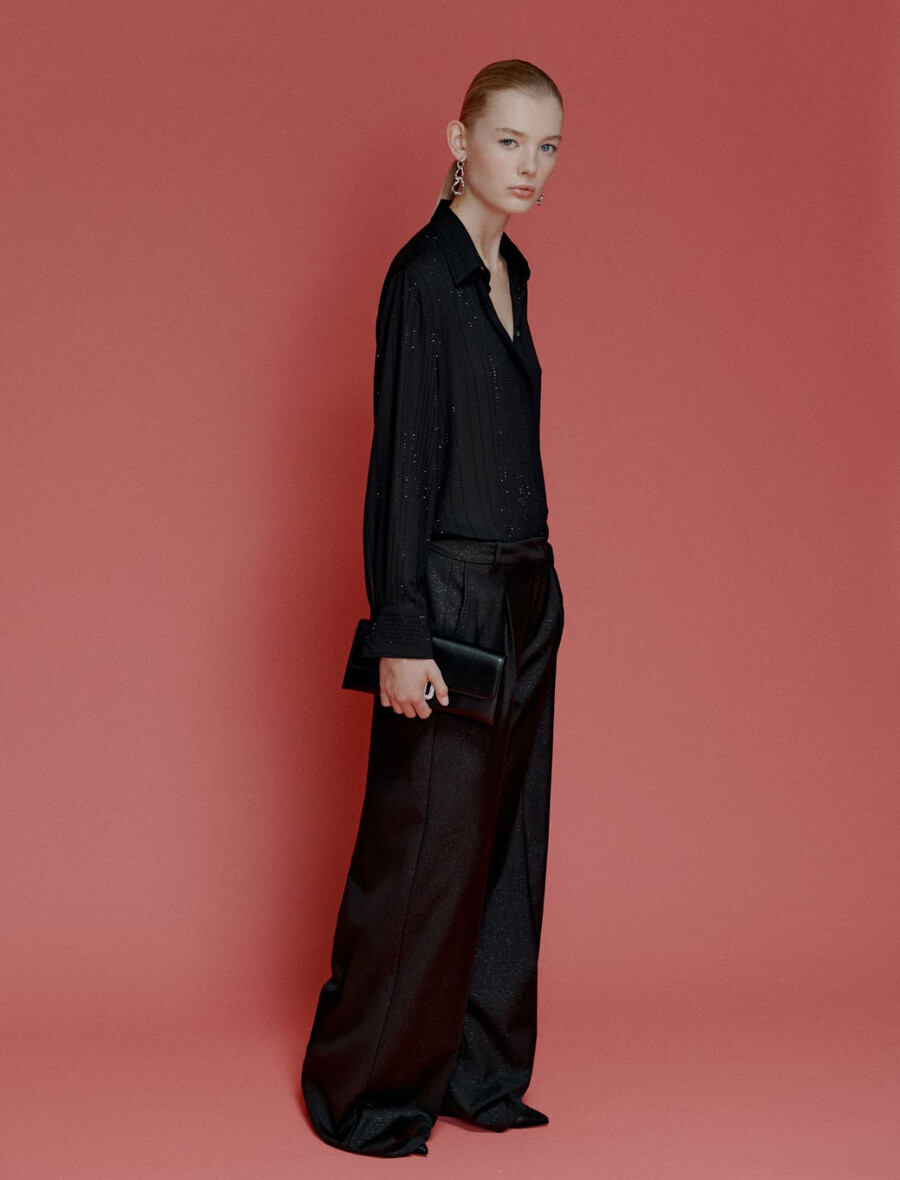 Conçue pour le soir, mais aussi idéale pour la journée : cette chemise en double georgette présente un motif à fines rayures irrégulières, illuminé par des strass scintillants.