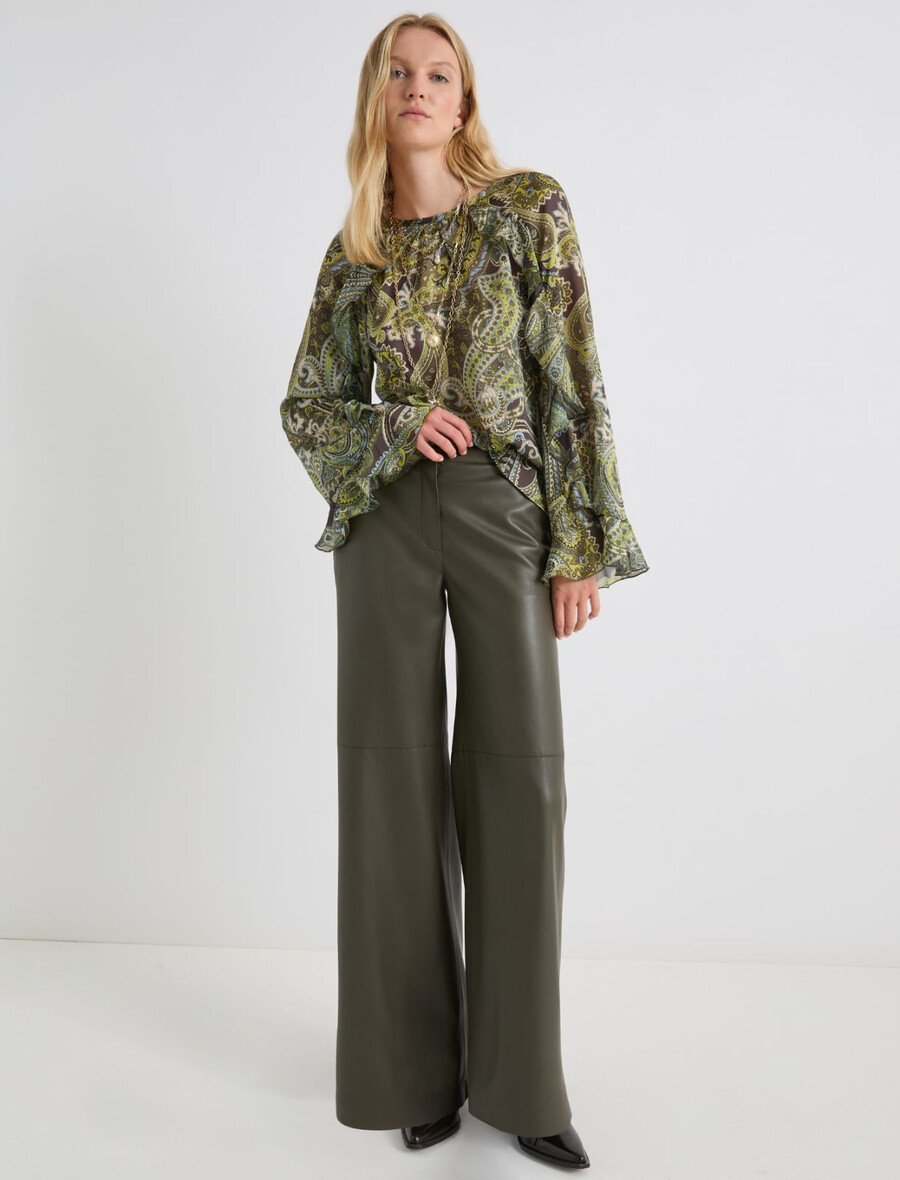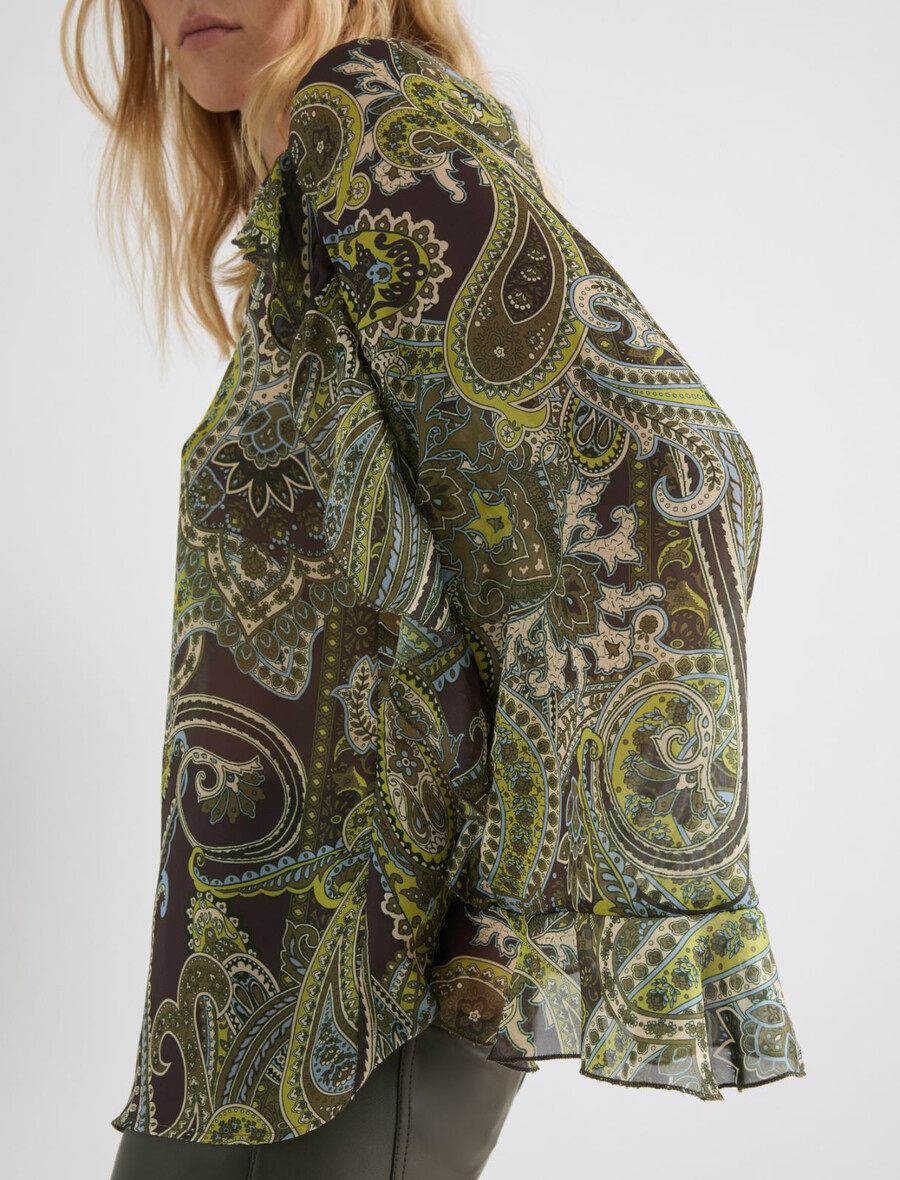 Un imprimé cachemire élégant et des volants romantiques : cette nouvelle chemise affirme un style unique grâce à ses teintes profondes et son tissu en mousseline légère.