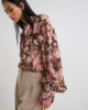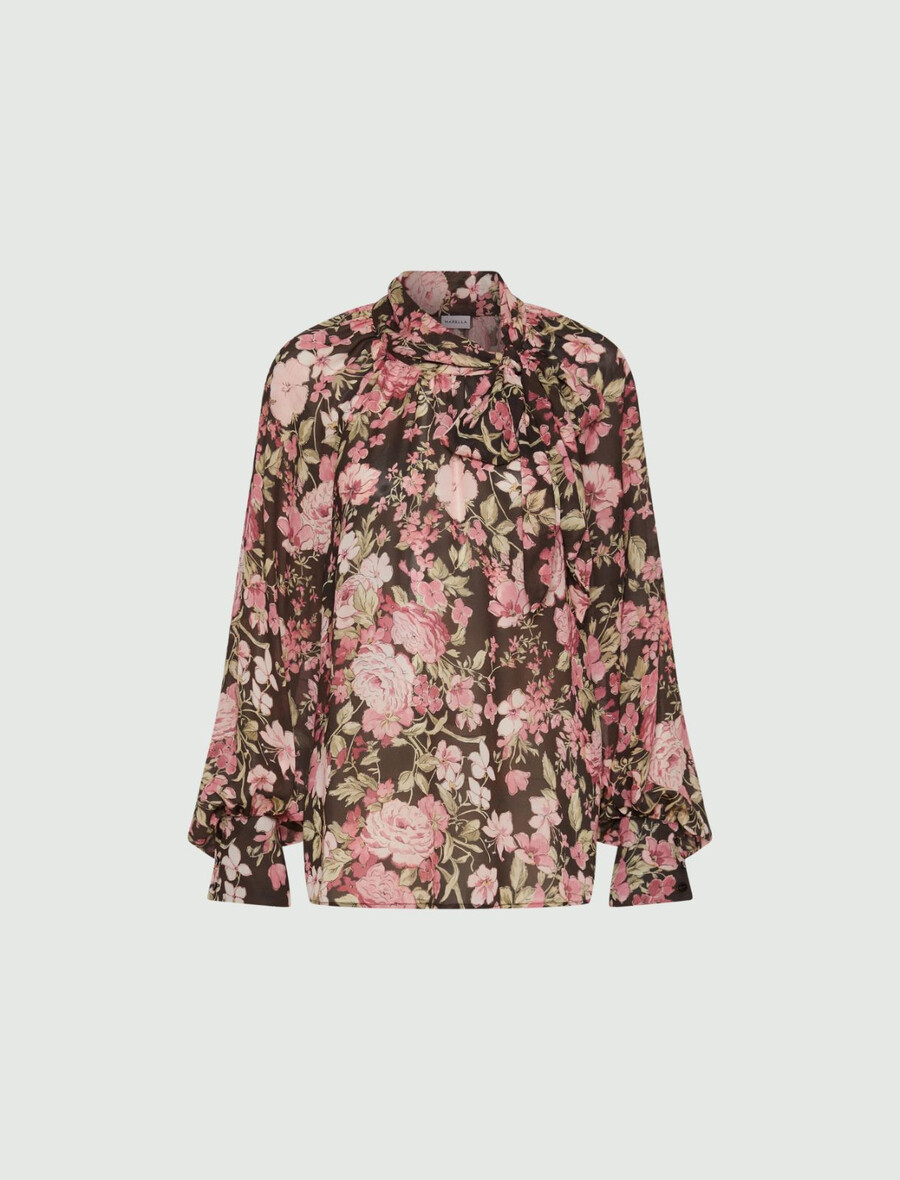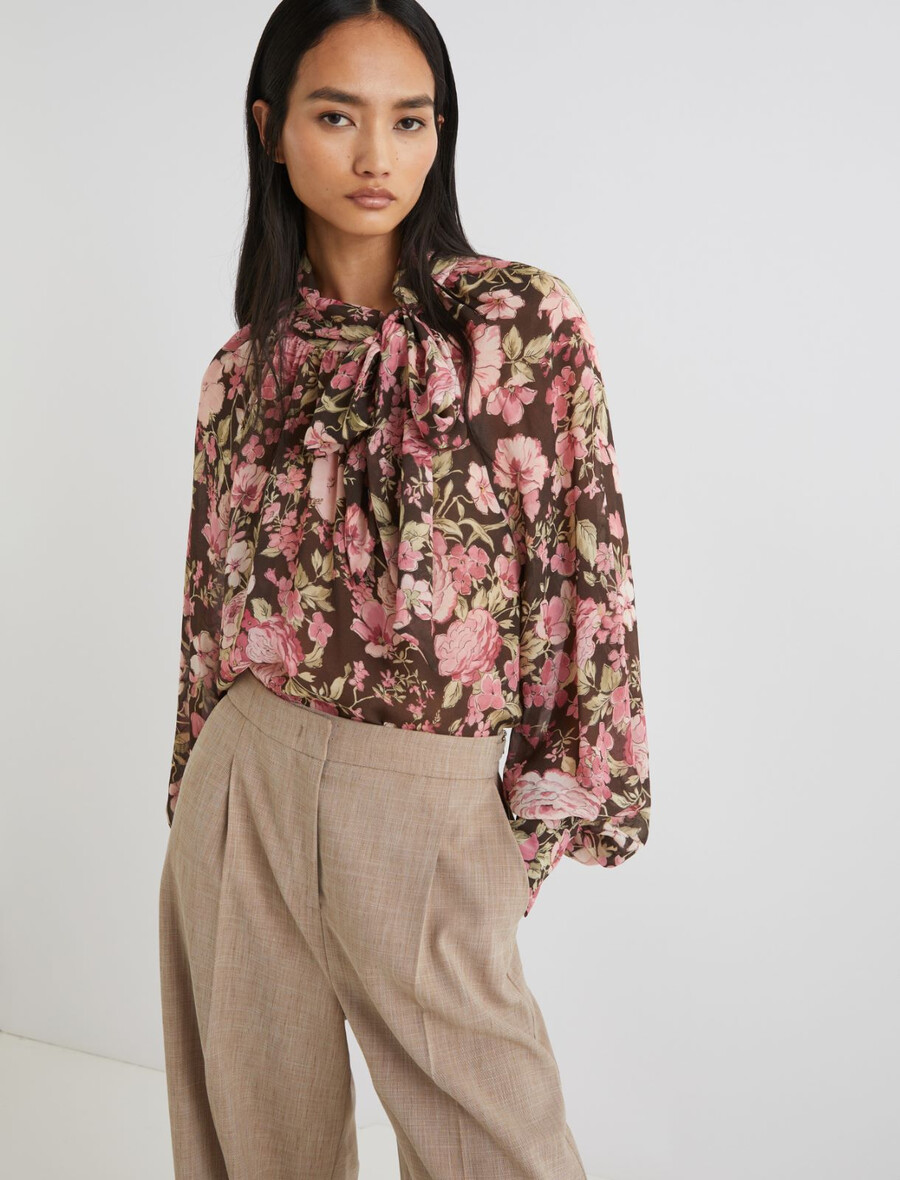 Ce chemisier en georgette à la coupe décontractée, orné d’un foulard à nouer autour du cou, présente un motif floral éclatant. À porter avec une veste courte assortie et un pantalon fluide pour un look décontracté et ultra-féminin.