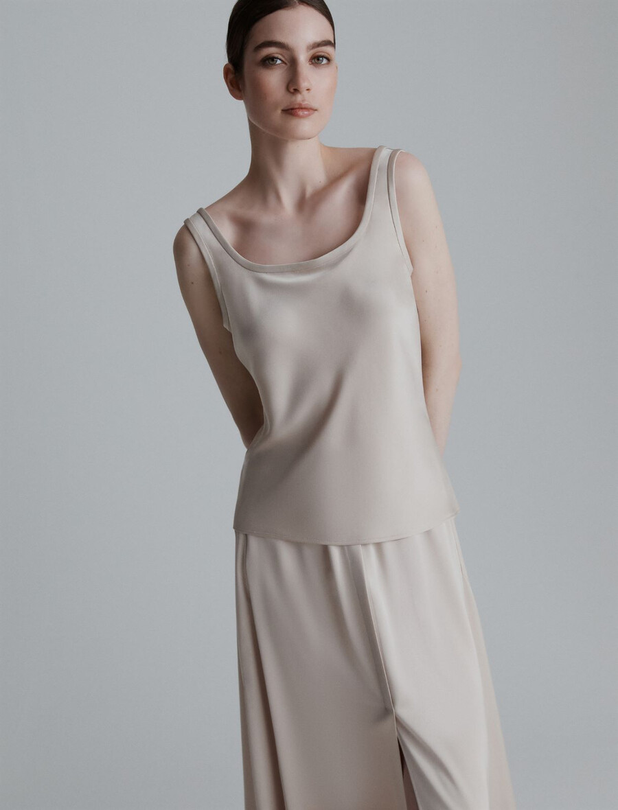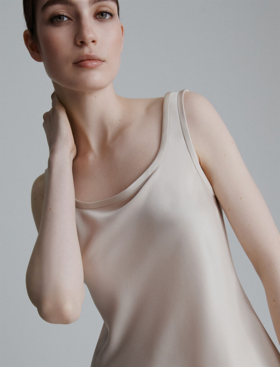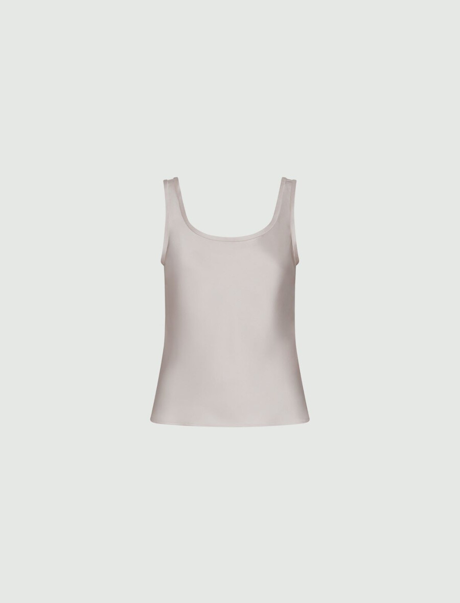 Top en satin à fines bretelles et encolure carrée sophistiquée. Parfait sous un blazer ou avec un pull vaporeux.