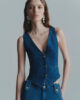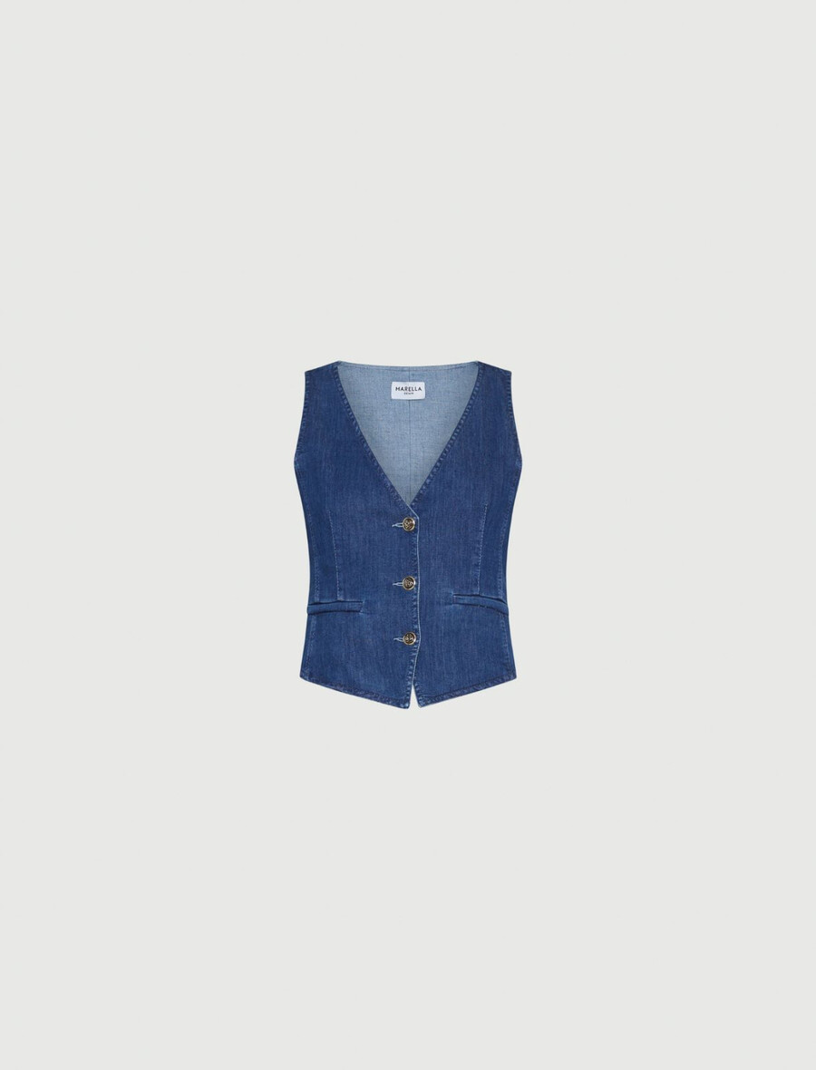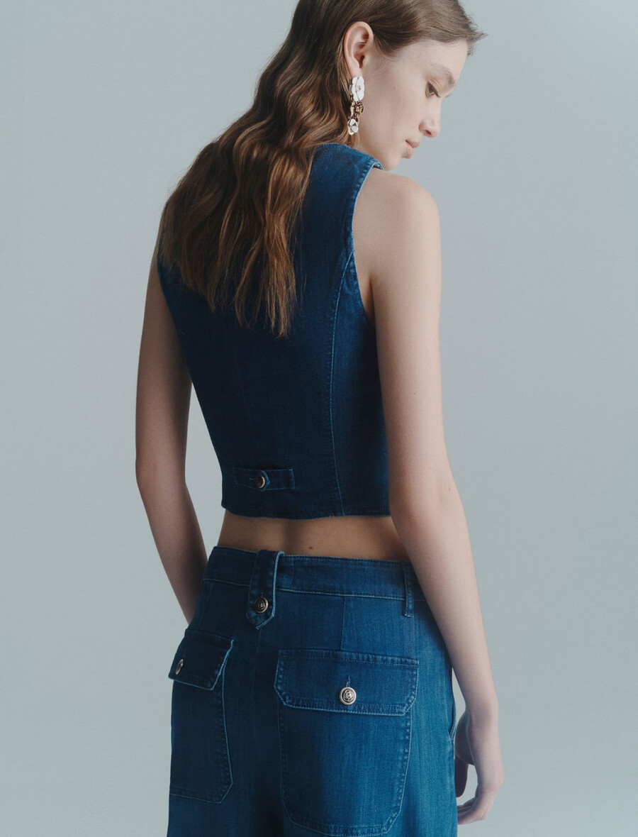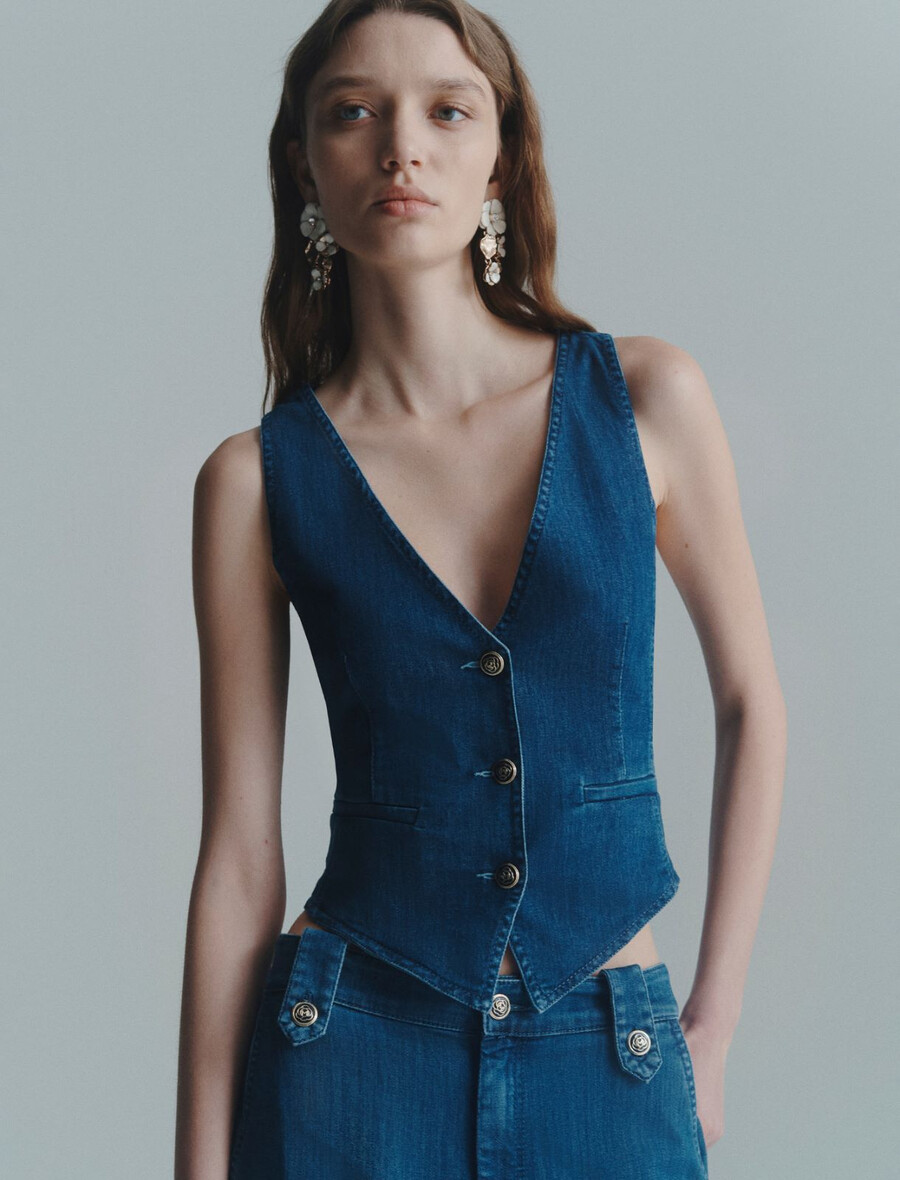 Sensuelle portée seule et polyvalente superposée à d’autres vêtements : cette veste sans manches en denim est irrésistible. Elle est ornée de boutons griffés et de surpiqûres contrastées pour une touche authentique.