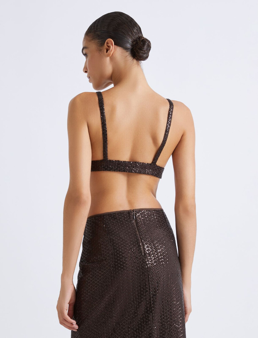 Minimaliste, scintillant et résolument sexy : ce top en tulle brodé de sequins met en valeur la peau nue grâce à des coupes originales et un décolleté plongeant. À associer à la jupe assortie mi-mollet pour une tenue de soirée qui ne passera pas inaperçue.