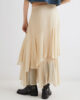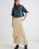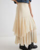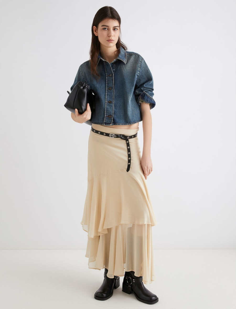 Jupe en georgette de soie pure, ornée d’un double volant asymétrique à l’ourlet pour une coupe dynamique et une touche romantique. Polyvalente, elle convient aussi bien aux occasions spéciales qu’à la ville, portée avec une chemise en jean et des bottines.