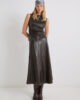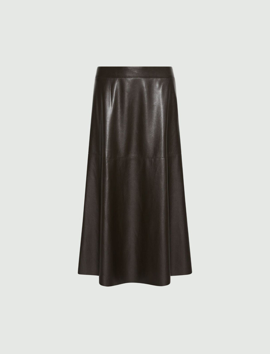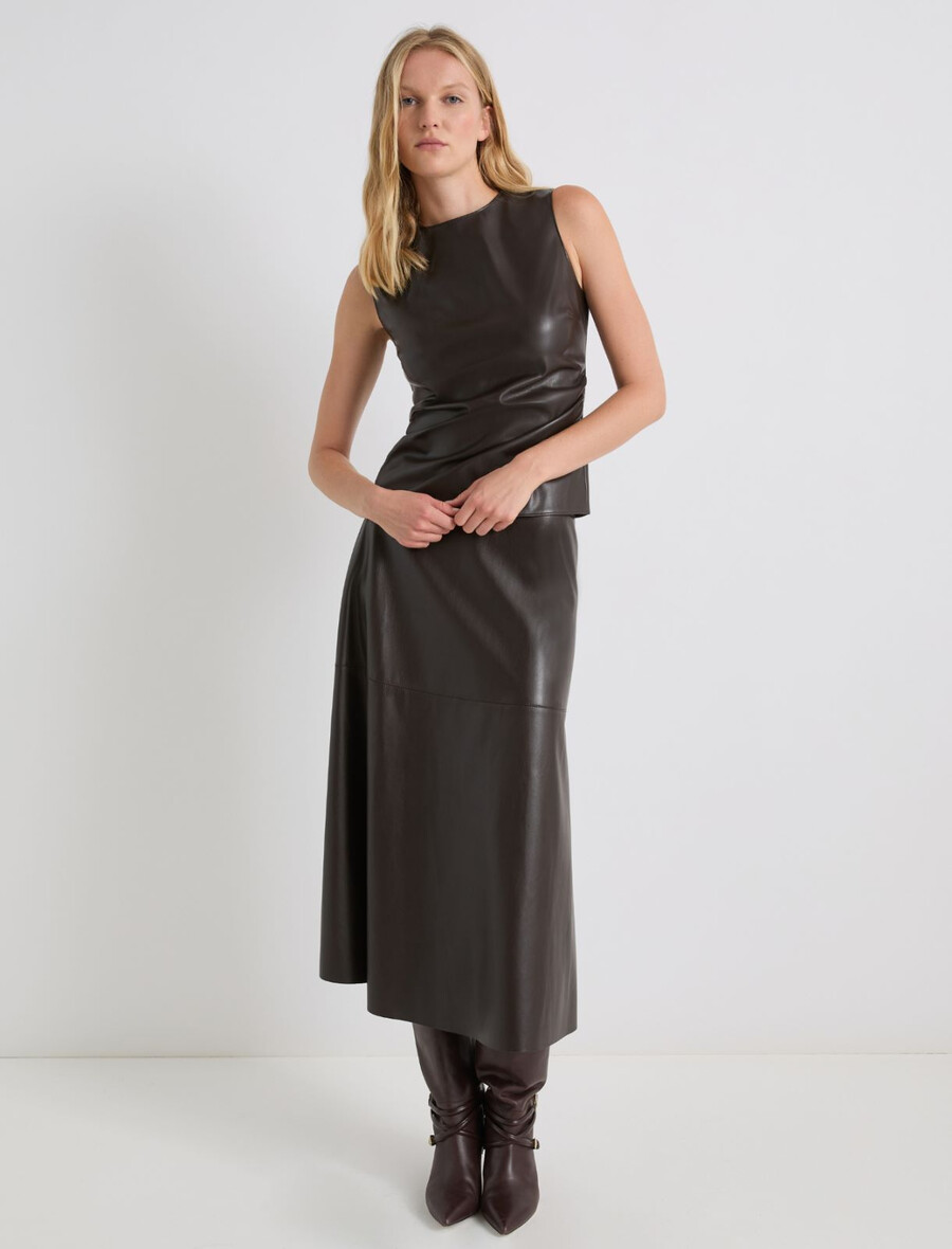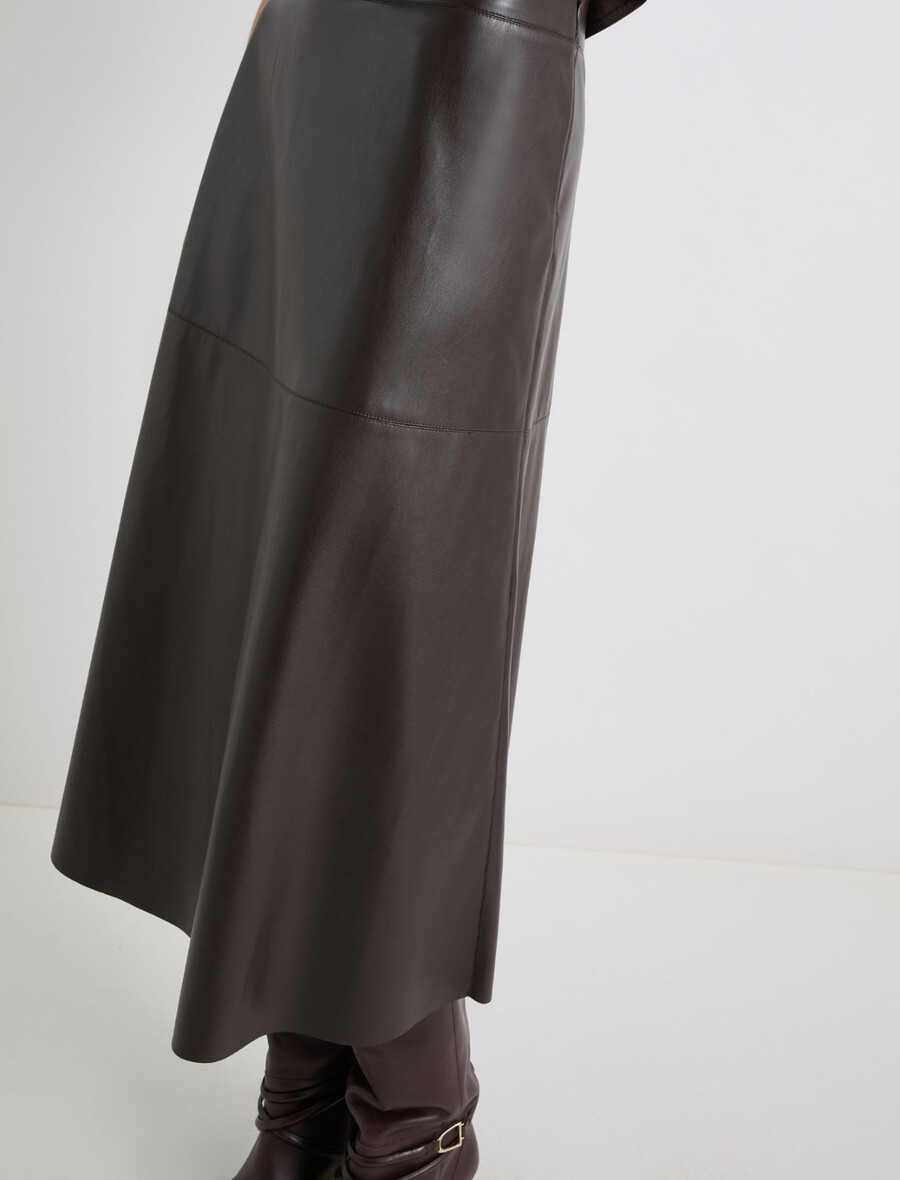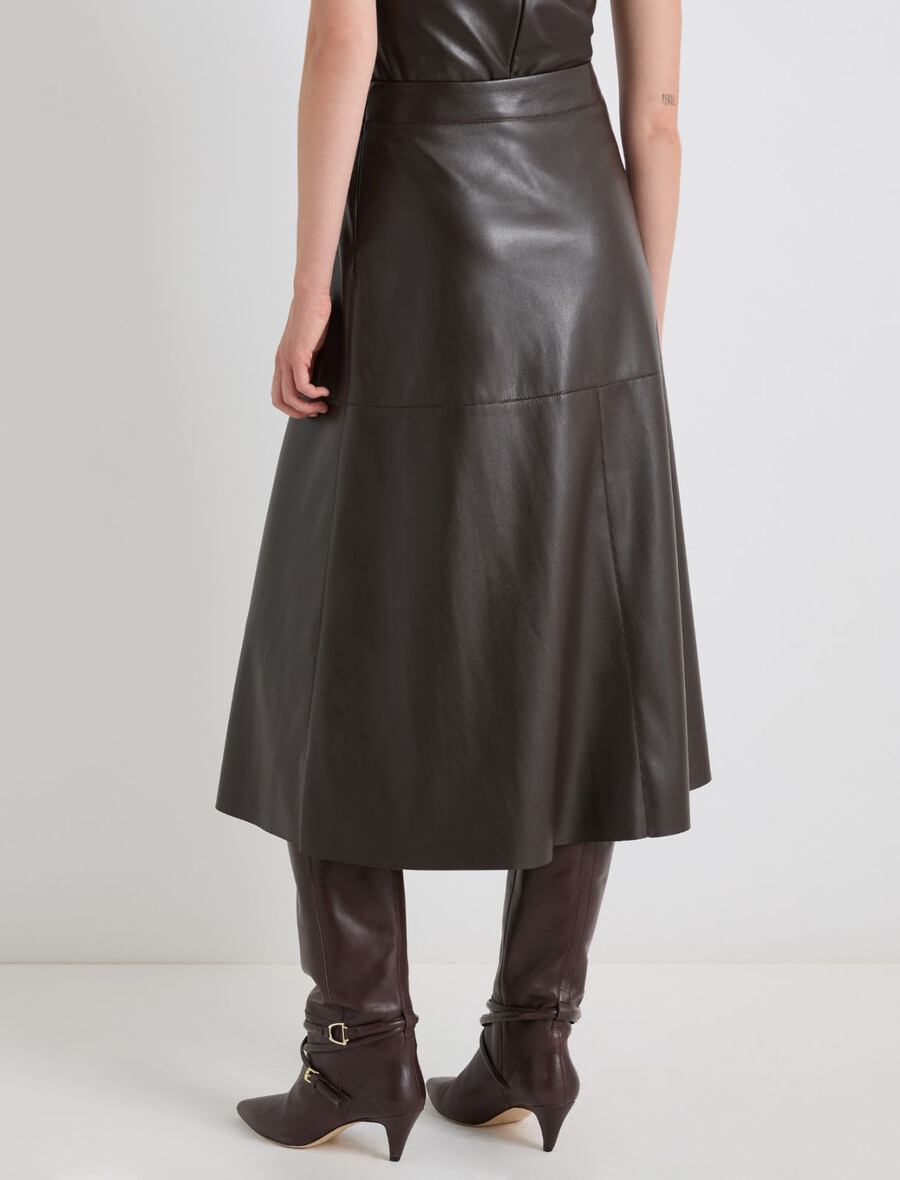 Cette jupe midi droite se distingue par son allure citadine et son caractère affirmé. Elle se marie parfaitement avec des pulls amples et une veste longue épaisse à l’aspect fourrure.