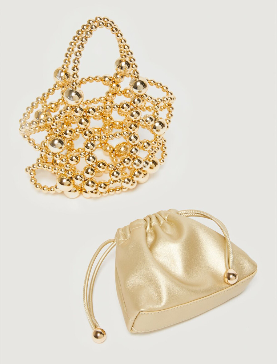 • Petit sac seau à larges maillons et détail de sphères de deux tailles.