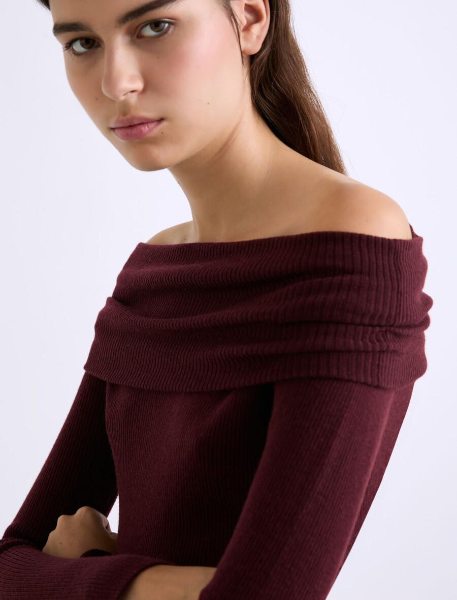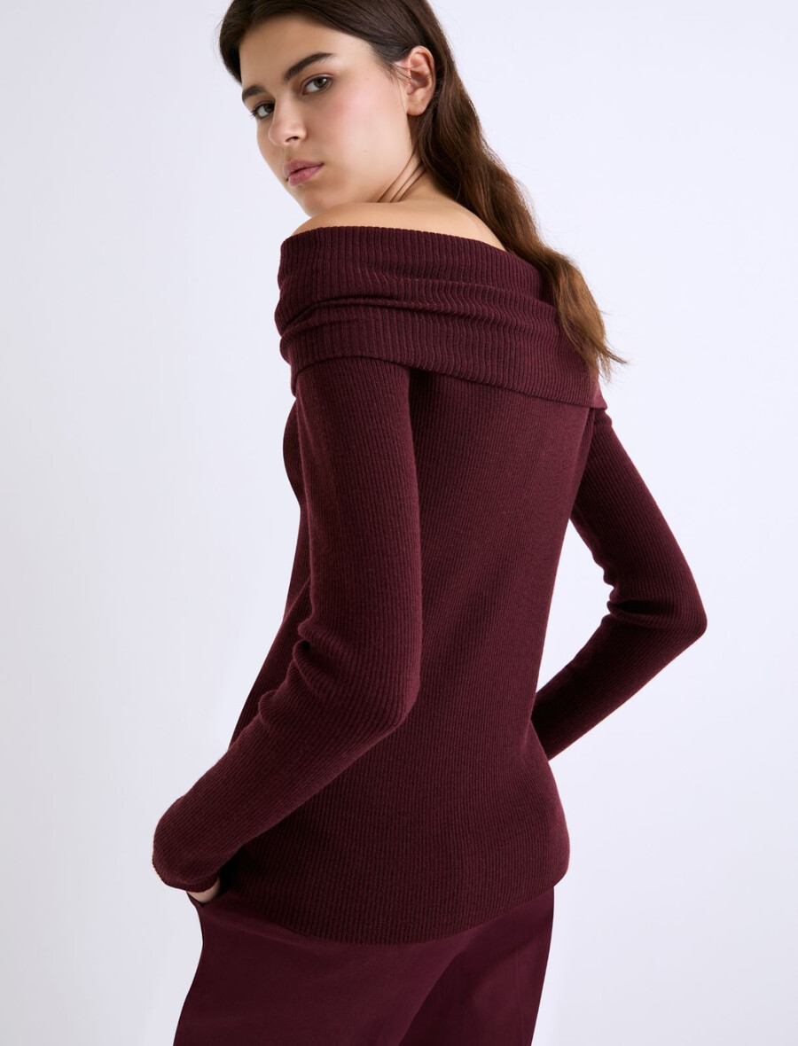 Ce pull en pure laine extra-fine présente une coupe ajustée et un col châle qui permet de le porter de différentes façons : sur le devant, comme un pull classique, ou épaules dénudées.