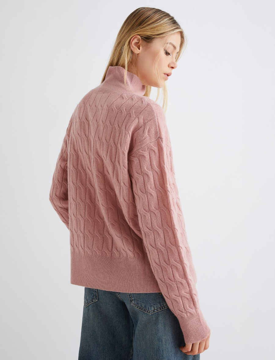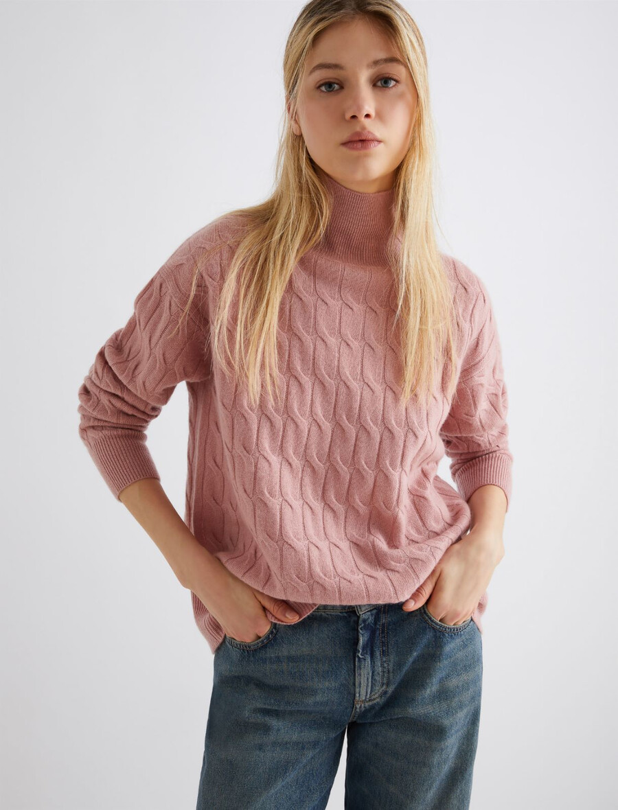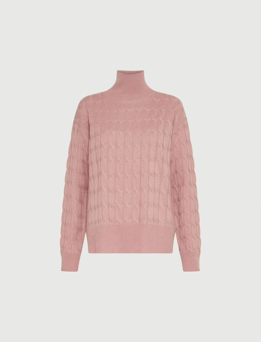 Une version féminine et chic du pull à col roulé classique et intemporel. La douceur de la laine et du cachemire, ainsi que le motif à torsades, en font une pièce polyvalente idéale pour la saison froide.