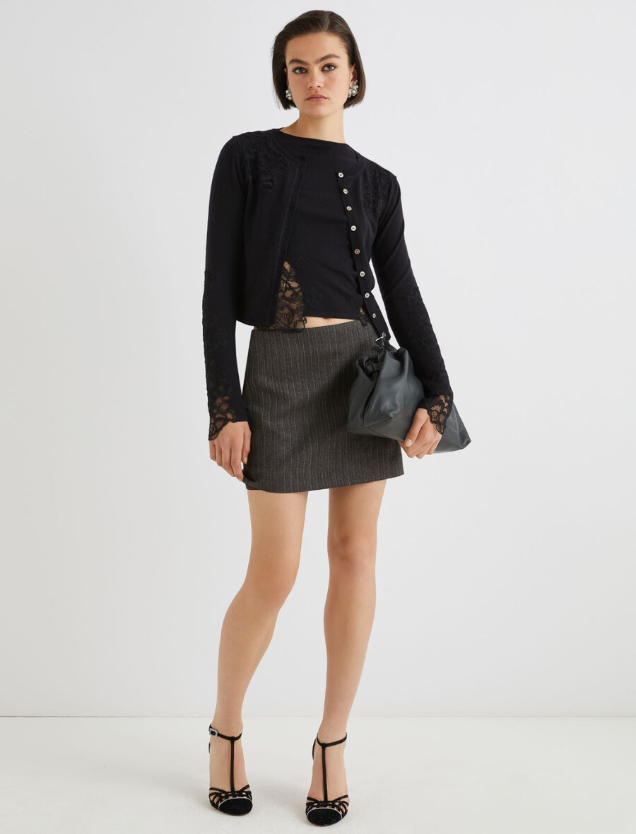 Ce pull polyvalent en laine stretch se réinvente avec une coupe ajustée et de délicates finitions en dentelle aux poignets et à l’ourlet. À porter avec la mini-jupe pour un look citadin et pétillant.