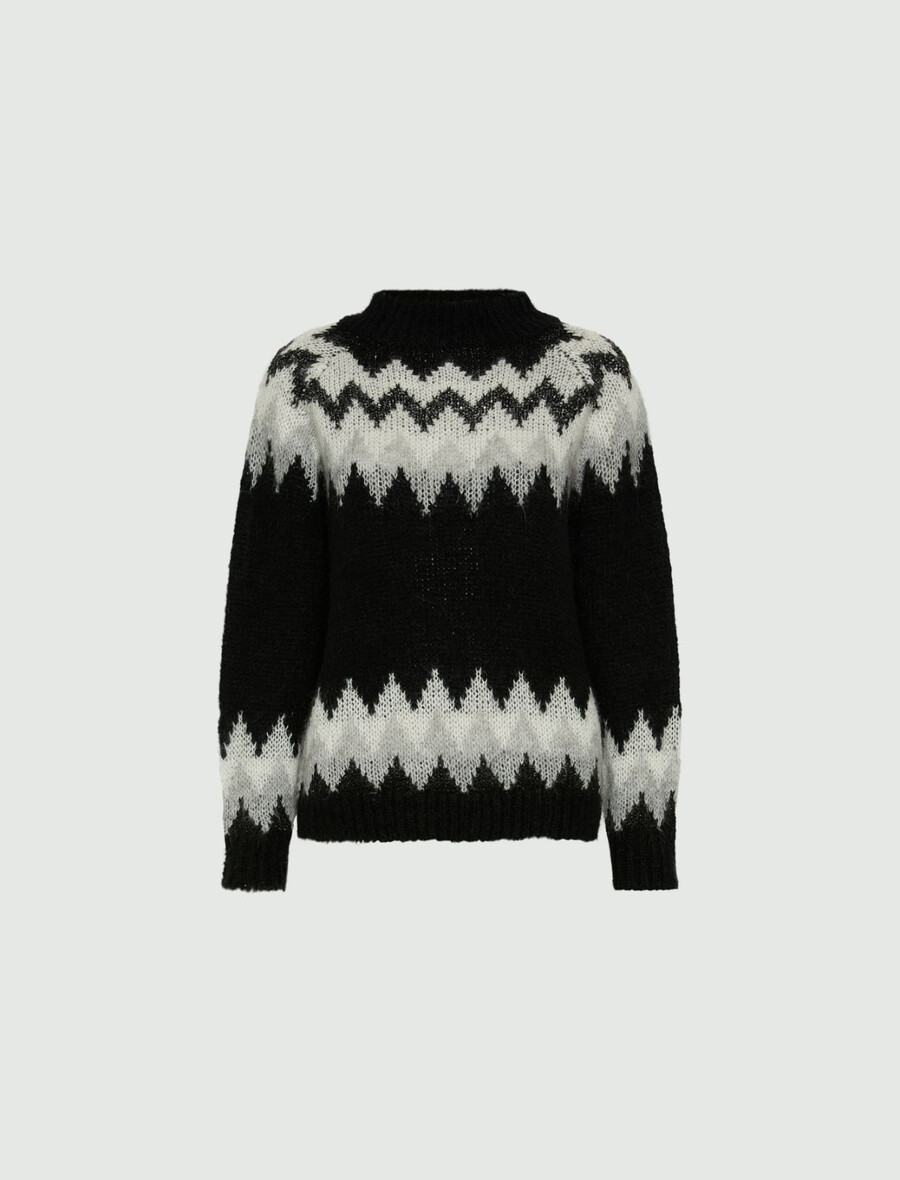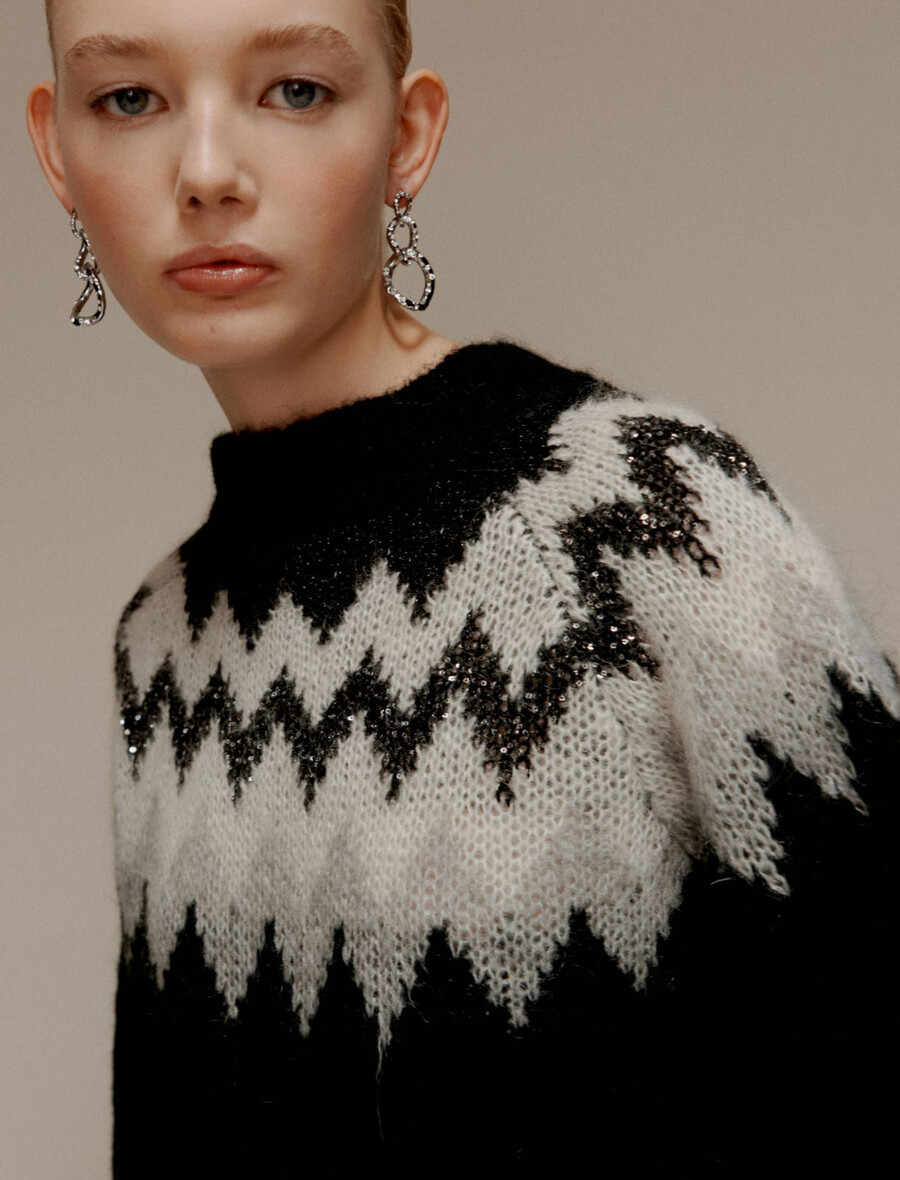Une version glamour du pull d’hiver par excellence : avec son motif norvégien emblématique, ce modèle est confectionné dans un fil léger et scintillant orné de sequins et de lurex.