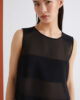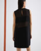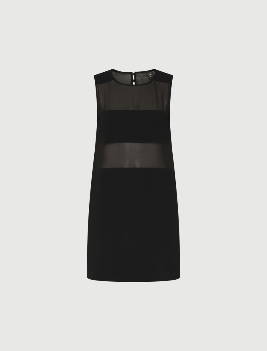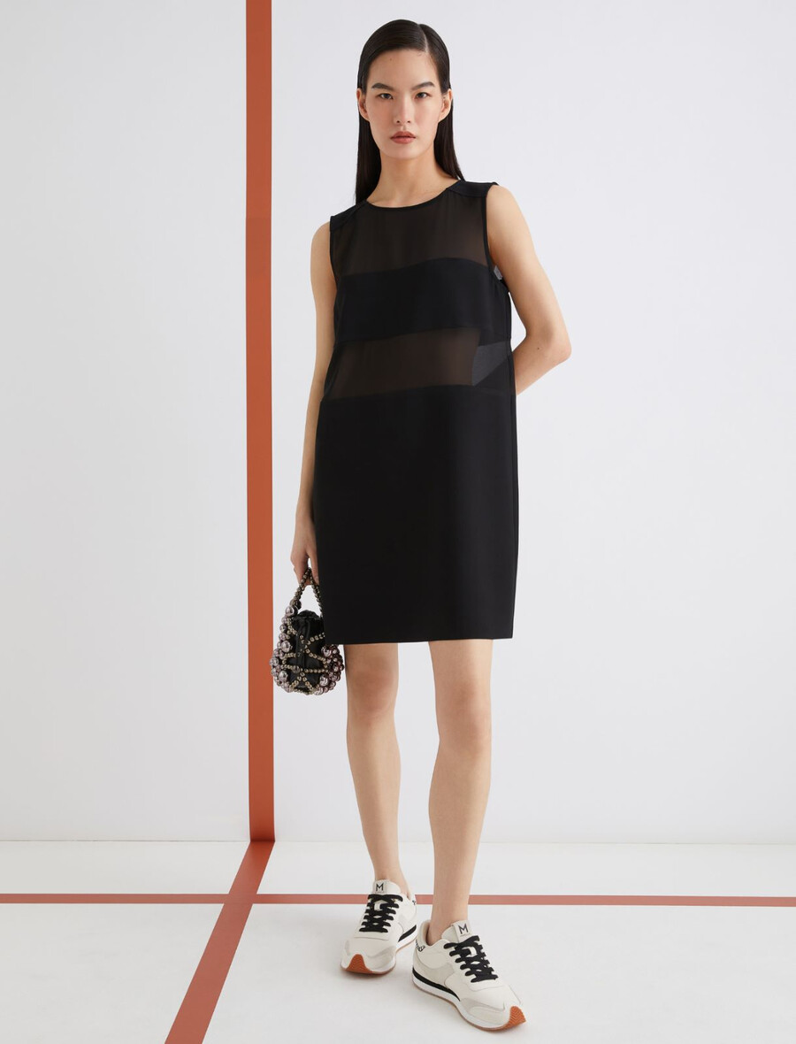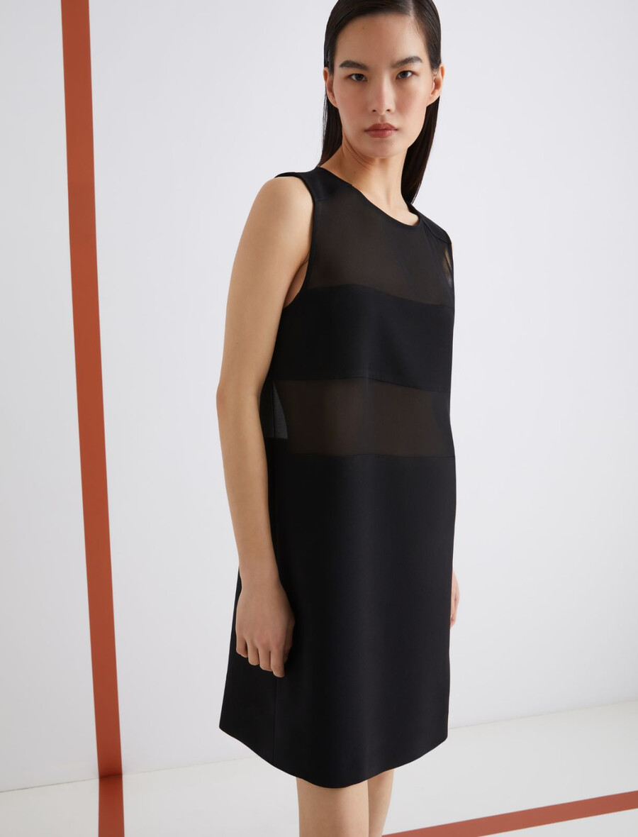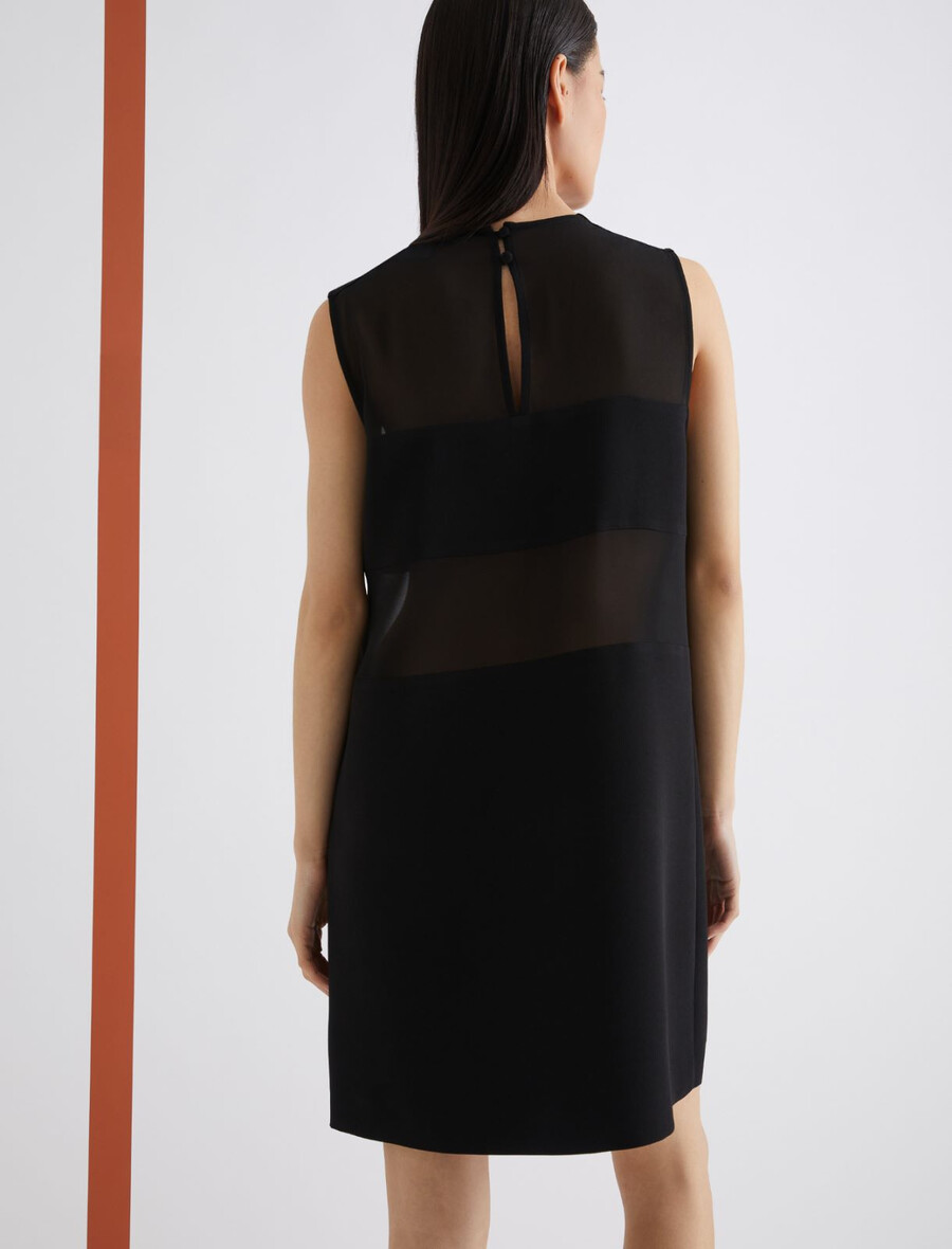 Une coupe essentielle et des matières sophistiquées : cette nouvelle robe sans manches en satin envers est ornée de panneaux horizontaux en georgette qui créent de subtils jeux de transparence sur le buste.