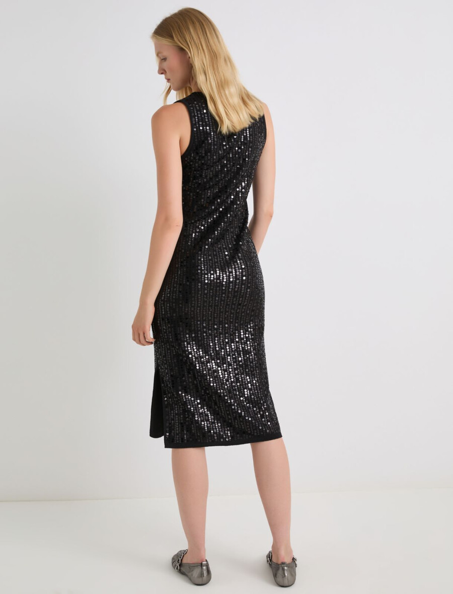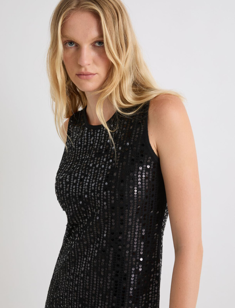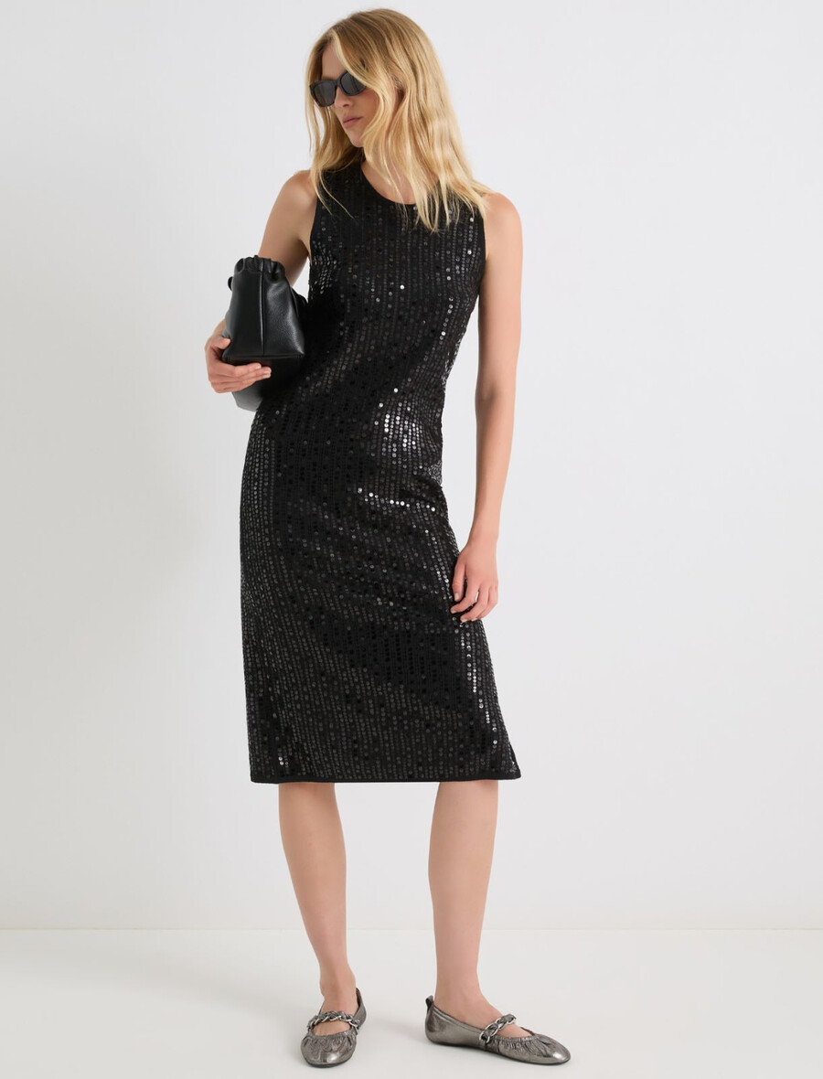 L’éclat de la mode : la nouvelle robe sans manches en maille bouclée ornée de sequins brodés pour un effet scintillant. Sa silhouette ajustée est sublimée par des pinces et des plis flatteurs.