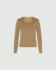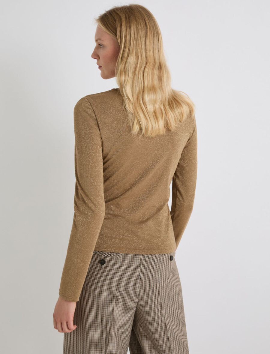 Un t-shirt à manches longues revisité avec un large col carré et des fils de lurex scintillants dans la trame.