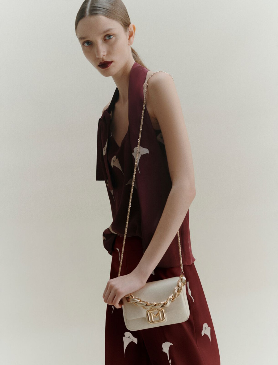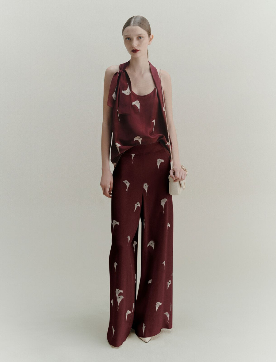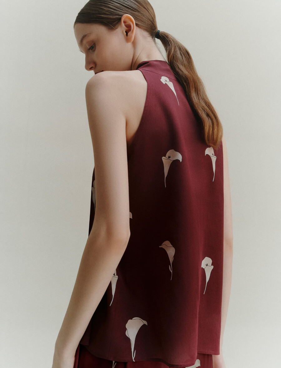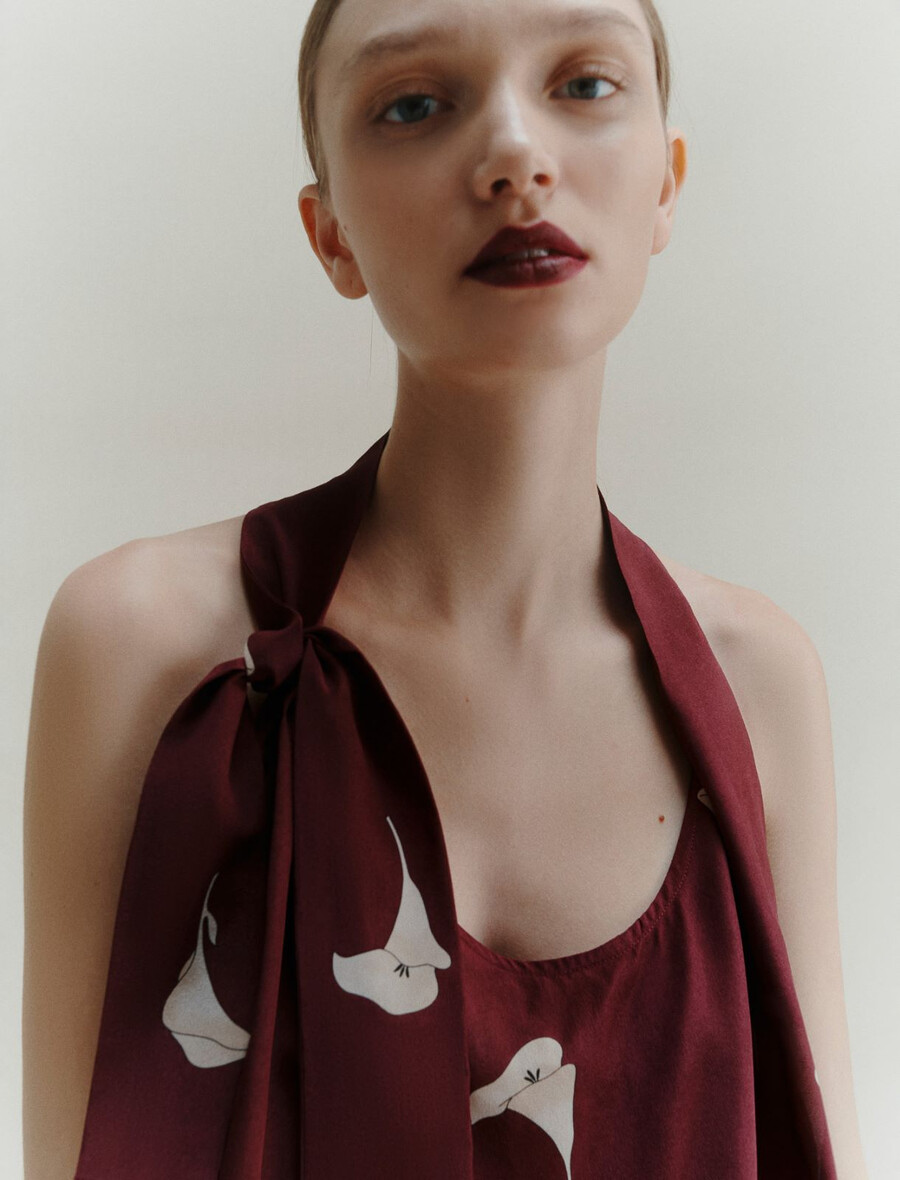 Des formes organiques et douces sur de la pure soie ondulent comme une danse lente : impossible de résister à ce nouveau top séduisant, doté d’une encolure large et d’une ceinture à nouer sur l’épaule pour un look encore plus original.