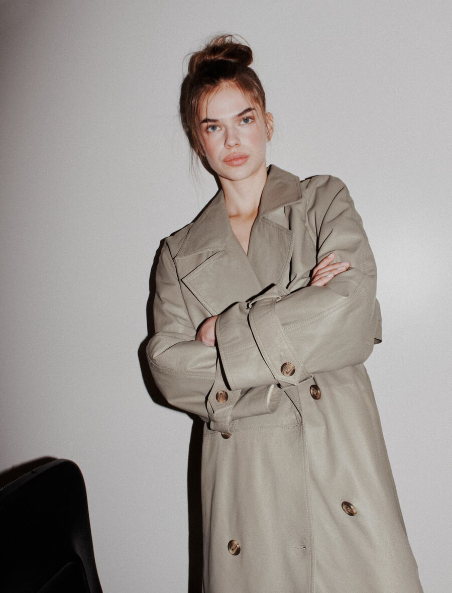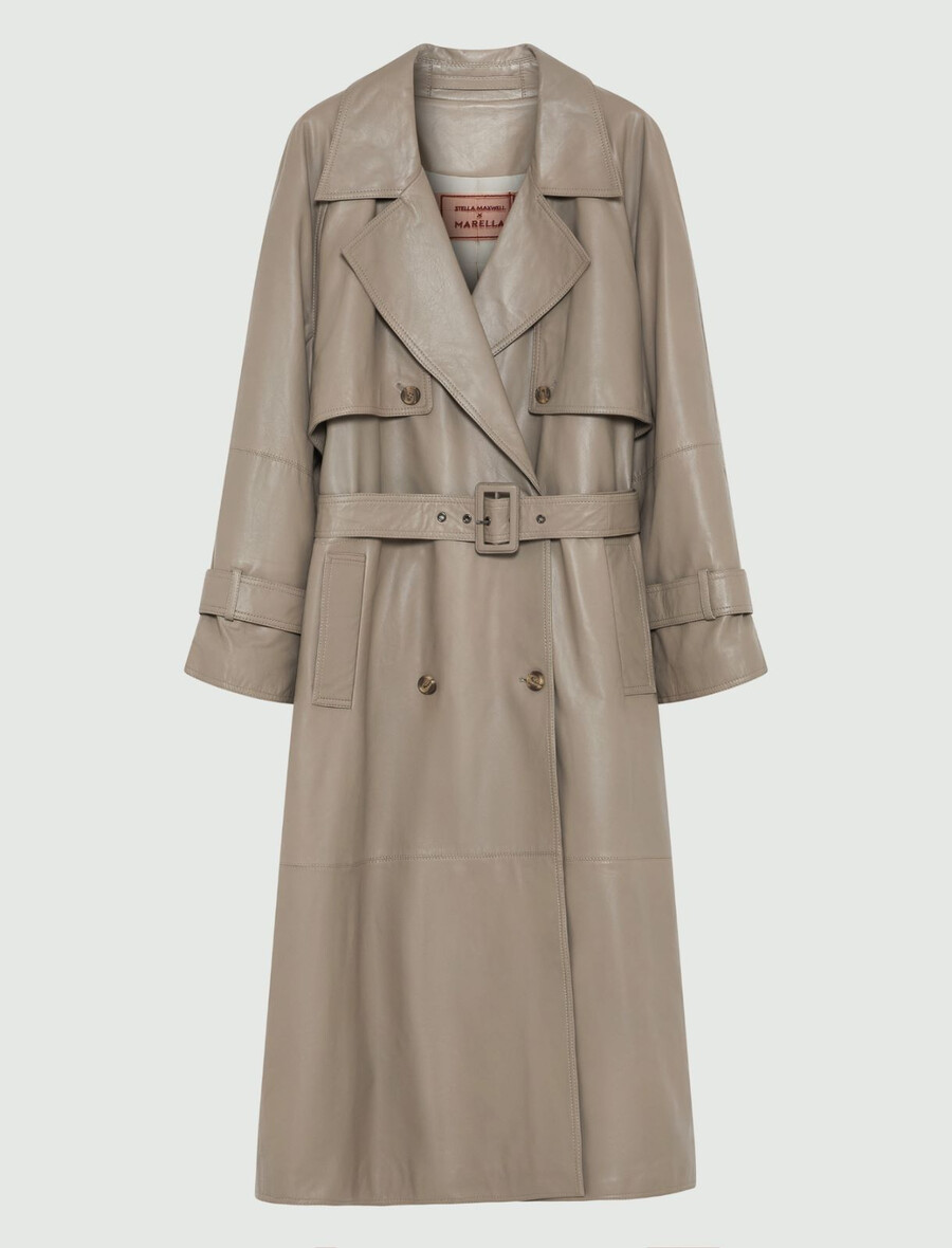 Ce trench-coat en cuir, à la texture douce et légère, est un incontournable de la saison. Sa coupe ample, ses détails structurés et sa fermeture par boutons et ceinture permettent d’ajuster la silhouette.