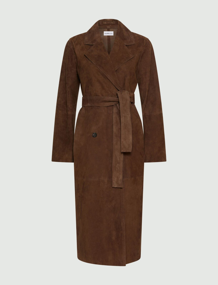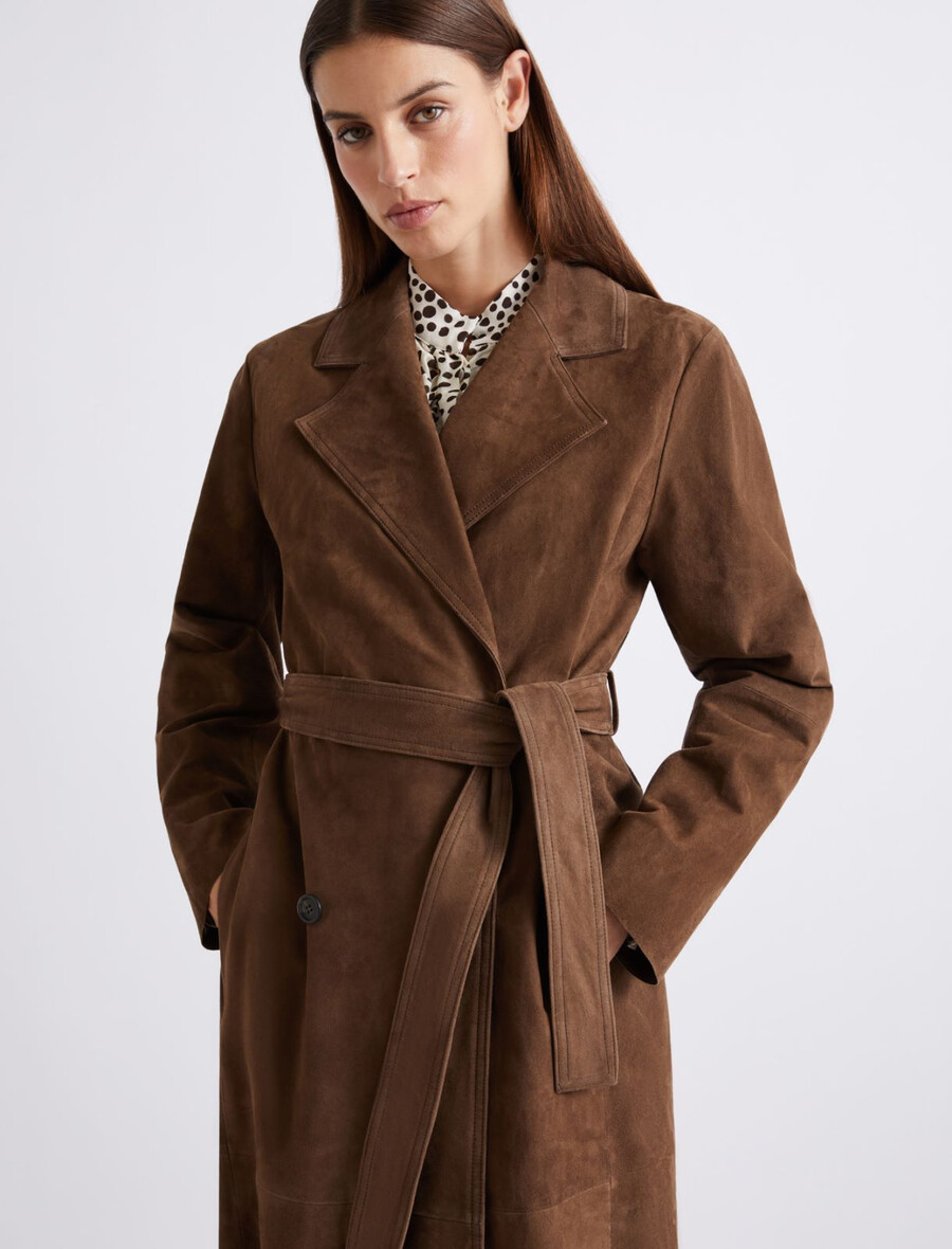 Une version urbaine d’une icône de style : l’élégant et intemporel trench-coat croisé se décline en daim souple. Sa coupe décontractée épouse la silhouette et se marie à la perfection avec sa ceinture assortie.