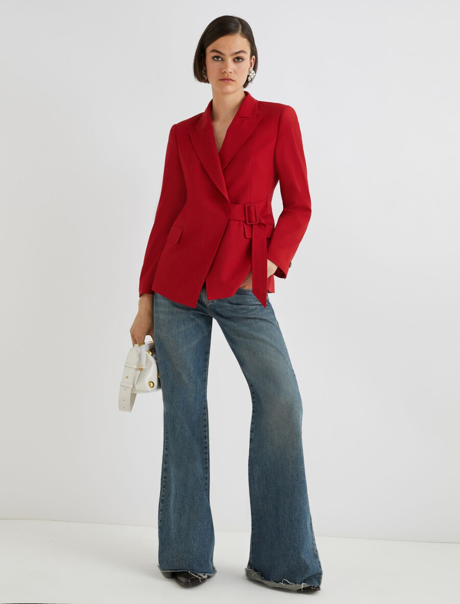 Cette nouvelle veste cintrée se distingue par ses nuances vibrantes et son design original. La ceinture à boucle latérale lui confère une allure résolument féminine.