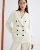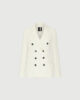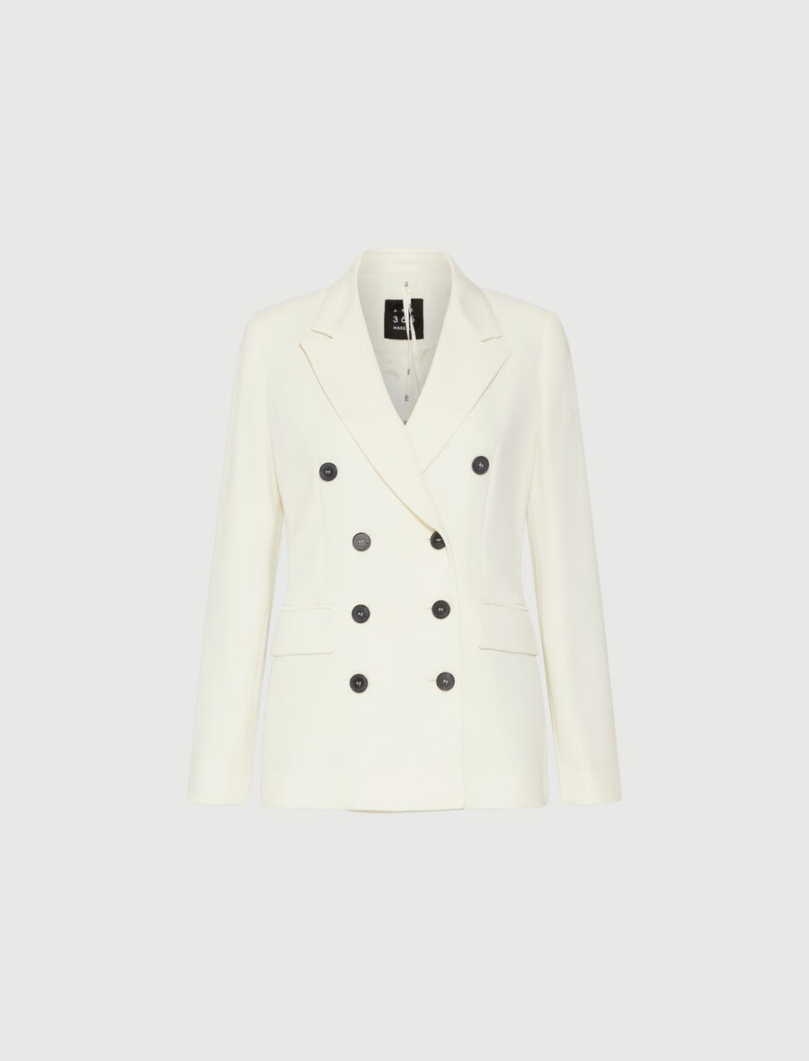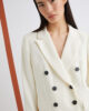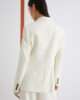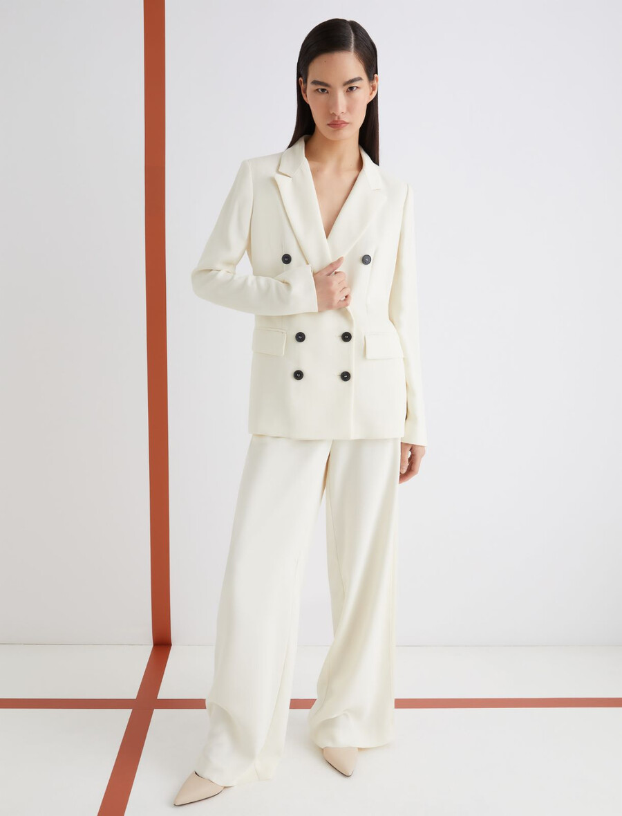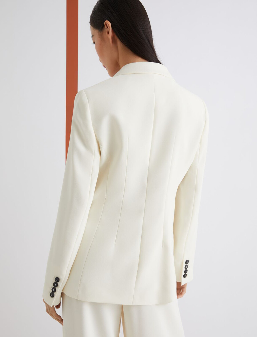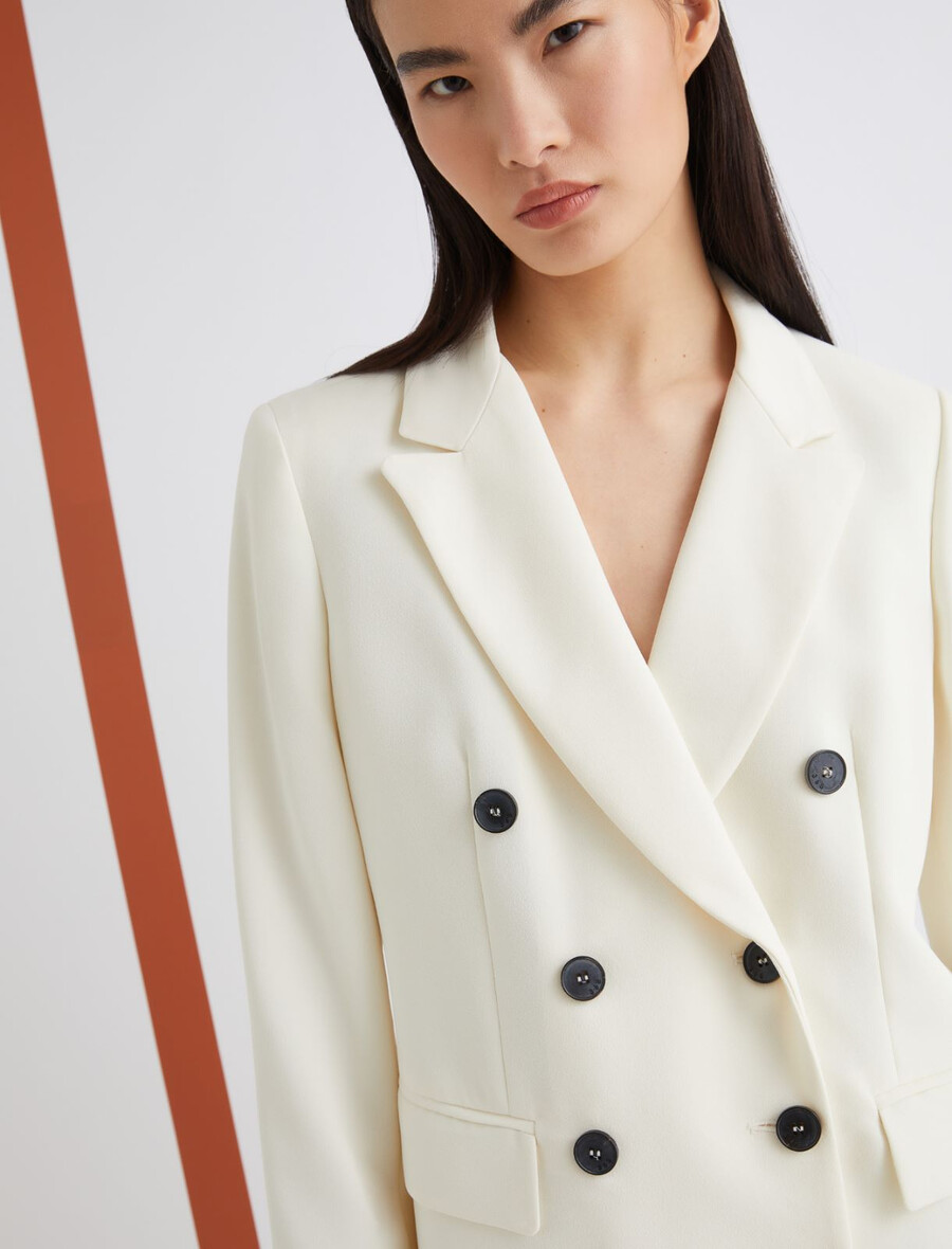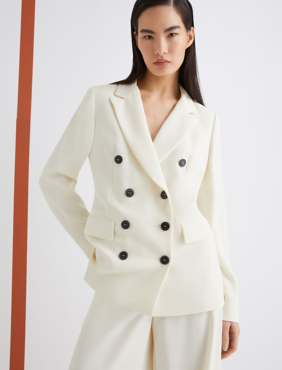 Cette veste de tailleur croisée se distingue par son caractère affirmé et son allure citadine. La touche de satin brillant à l’encolure évoque l’élégance d’un smoking, créant ainsi un modèle à porter en toutes occasions avec des pantalons et des jupes assortis.