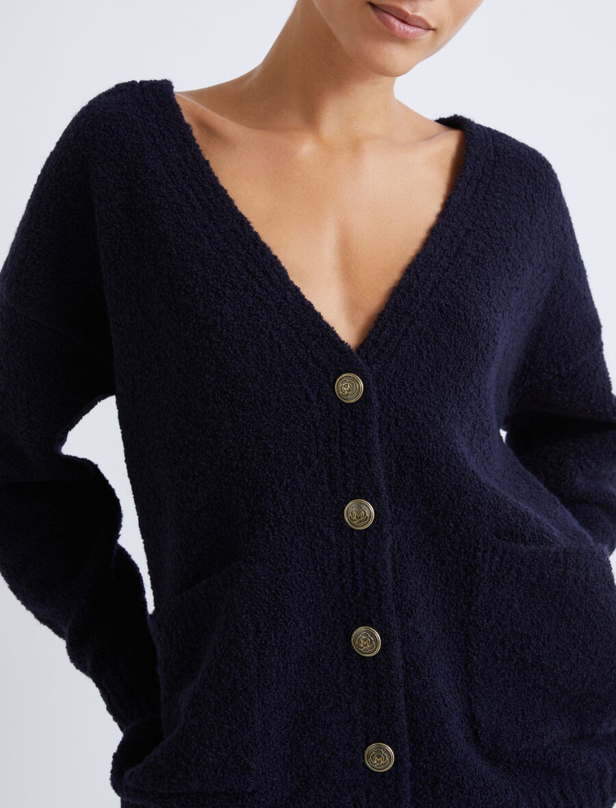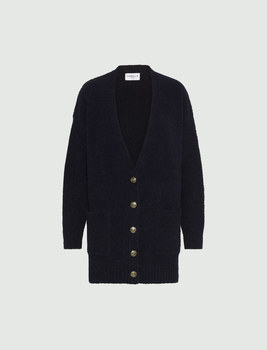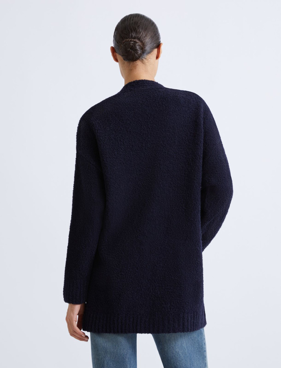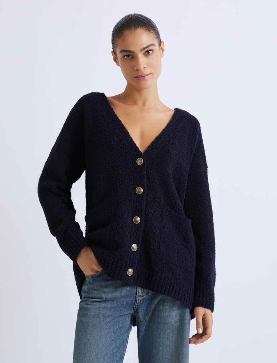 Une version contemporaine de la veste en jersey, avec une coupe oversize et des boutons métalliques brillants griffés. Portez-la comme un manteau fluide avec des robes et des pantalons tailleur pour un contraste de silhouettes original.